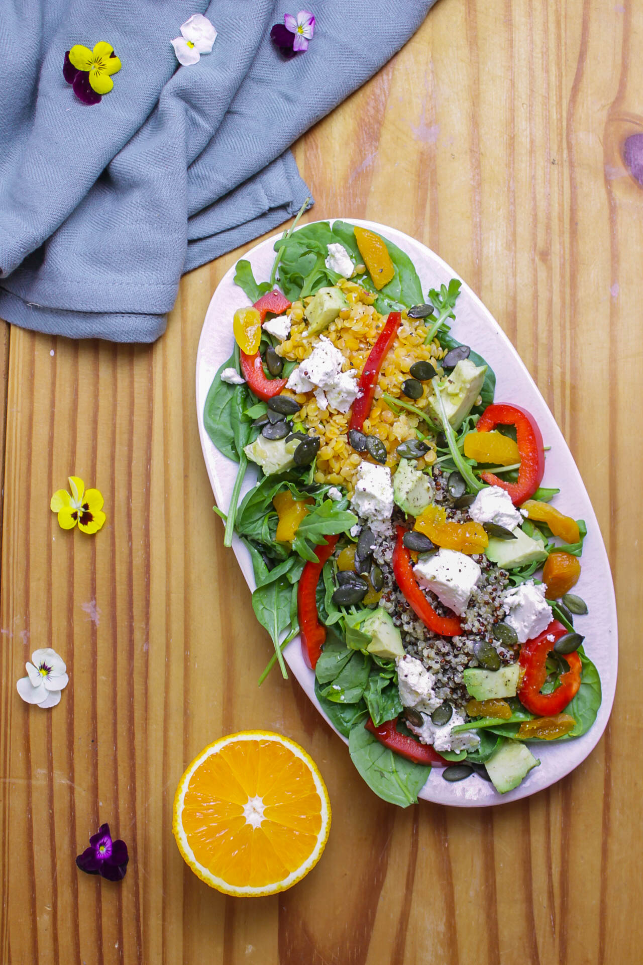 Eine Salatbowl mit Spinat, Quinoa, Feta, Paprika, Kürbiskernen und getrockneten Marillen (Aprikosen) ist nicht nur ein optischer Hingucker. Er ist fruchtig und lecker, und ein wahrer Eisen-Booster. Ob mit oder ohne Fleisch – du kannst ihn flexibel an deine Ernährung anpassen.
