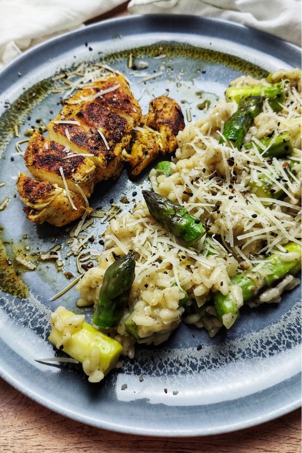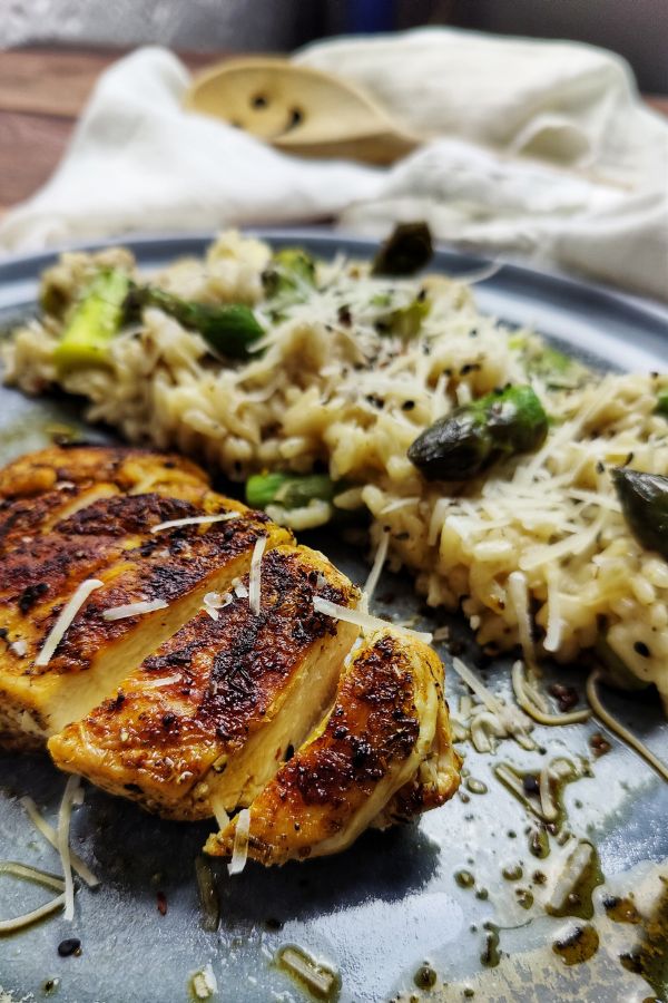 Italienisches Spargelrisotto mit Hähnchenbrust: cremig, würzig & herrlich knusprig